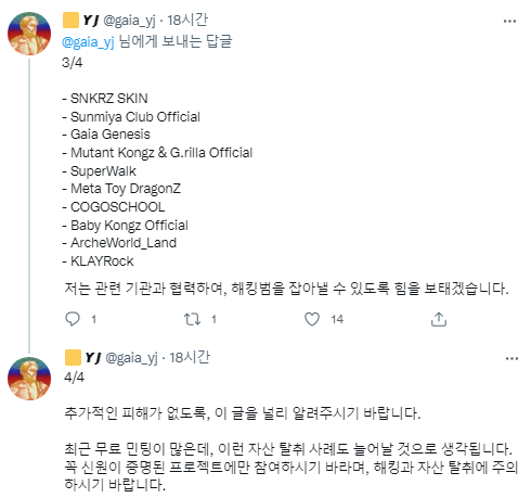 자산 탈취 대상 목록에 있는 프로젝트들 중 선미야 클럽과 가이아 프로토콜은 디스코드에 해당 공지를 올리며 추가 피해를 막기 위해서 노력하였다. 특히, Money Tiger의 스캠 사실을 알린 가이아 프로토콜의 디렉터인 심영재님은 해킹범을 잡을 수 있게 적극적으로 관련 기관과 협력하여 문제를 해결하려는 의지를 보여주었다.