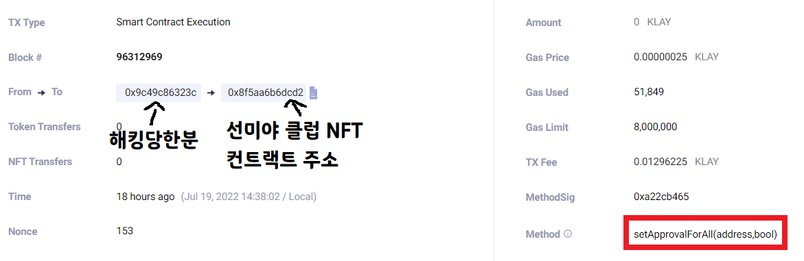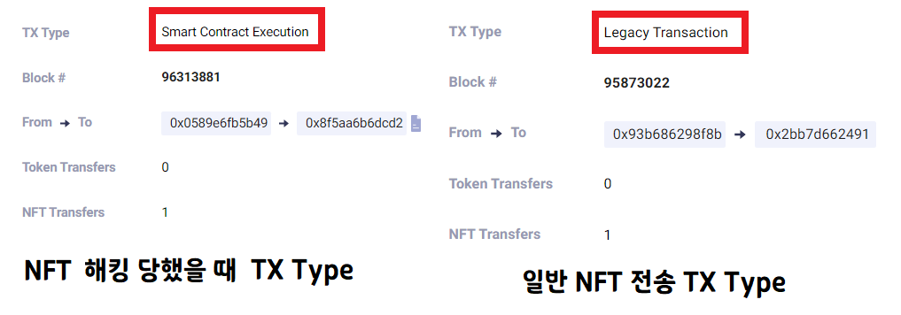 일반적인 NFT 전송할 때는 TX Type은 Legacy Transaction이 쓰이지만, Set Approval for All 트랜잭션 창을 허락하고 NFT를 탈취당했을 때에는 Smart Contract Execution이 쓰이는 것을 볼 수 있다.