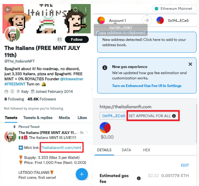 일반적인 스캠 피싱의 경우, 트위터에 스캠 링크로 민팅을 유도하고, 해당 사이트에서 NFT들을 탈취해가는 방식이었다. 그래서, 사람들의 머릿속에 아무 링크나 누르면 안 된다는 인식이 자리 잡혔다. 하지만, 이번에는 유명한 NFT 마켓인 오픈씨에 해당 NFT 컨트랙트 주소와 함께 홈페이지도 올라와있어서 해당 NFT가 피싱인지 의심하기 쉽지 않았다.