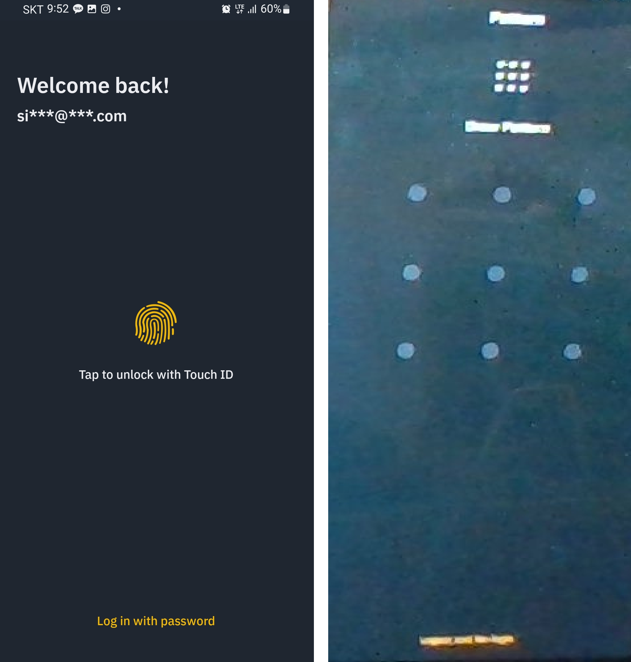 Touch ID는 좌측화면처럼 바이낸스 앱 실행시 지문을 인증하면 로그인할 수 있는 화면이다. Pattern은 지정한 패턴을 입력하면 바이낸스 앱에 로그인할 수 있는 화면이다.