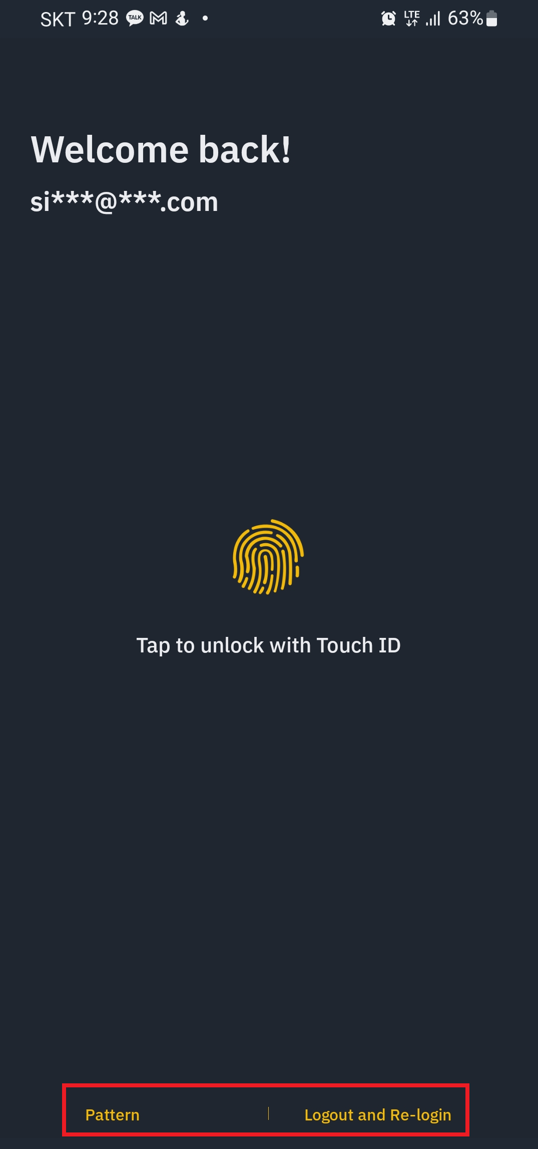 참고로, 둘다 설정가능하며, 둘 다 설정하면 바이낸스 앱 실행 시 Touch ID가 먼저 뜨고 패턴은 밑의 화면에 대체수단으로 Pattern으로 로그인하는 것도 가능하다.