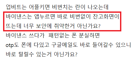 바이낸스 어플을 사용하다보면, 이렇게 따로 로그인 없이 바로 자동로그인이 되는 경우가 더러 있다. 필자는 이것을 마냥 간편하다고 생각하면서 사용하고 있었는데, 예상치 못한 질문이 들어왔다.