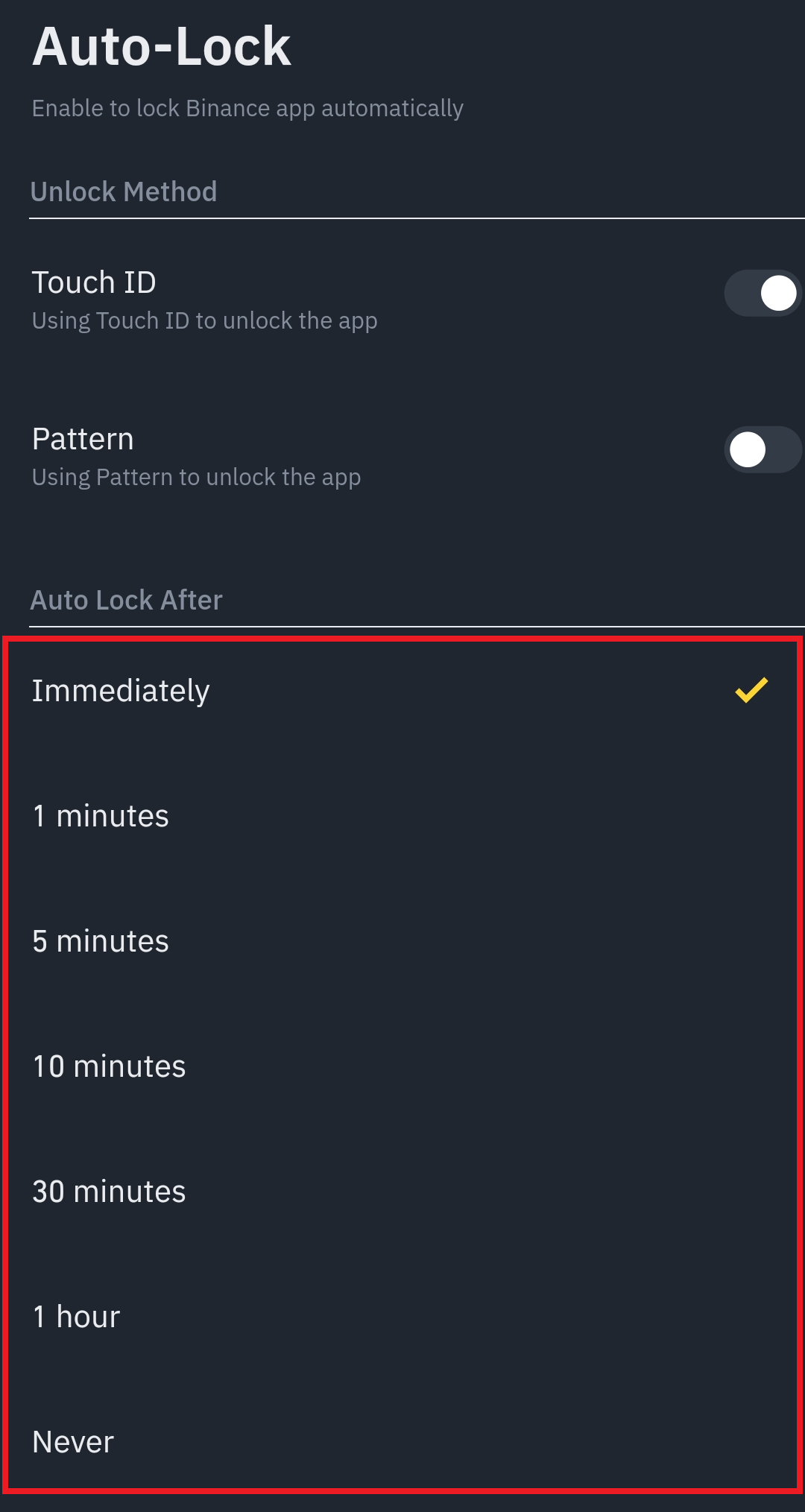 Auto-Lock은 시간 설정이 가능하다. 앱 종료 후, 몇 분 후에 잠금설정을 할 것인지 선택할 수 있다. Immediately를 선택하면, 앱을 언제 종료하든 상관없이 로그인할 때마다 잠금화면이 생성된다. 반대로, Never을 선택하면 잠금화면 없이 기존처럼 바로 로그인이 된 바이낸스 앱의 모습을 볼 수 있다.