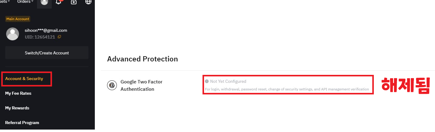 이제 로그인하면, Google 2FA를 요구하지 않아 바로 로그인이 가능하다. Security 메뉴에 가면 Google Two Factor Authentication가 해제된 모습도 확인할 수 있다.