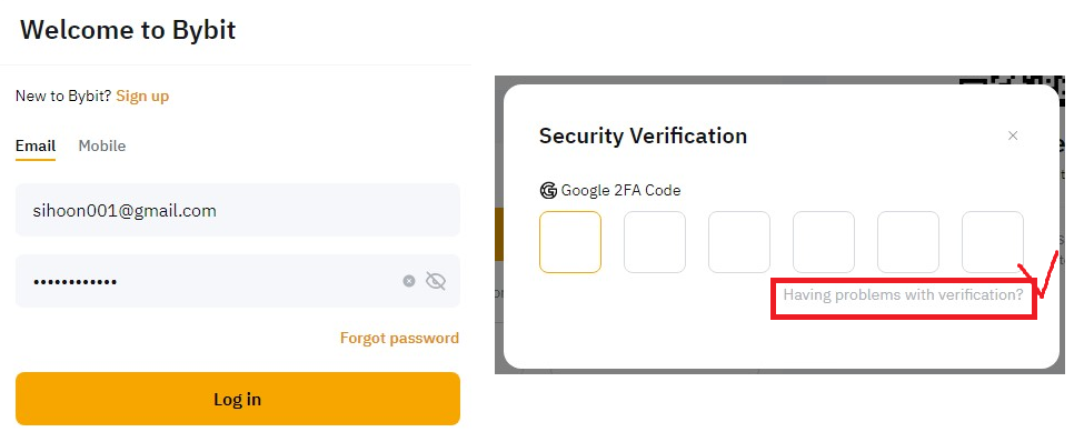 바이비트 로그인후, Google 2FA 인증화면이 나올 시 'Having problems with verification?'를 클릭해 준다.