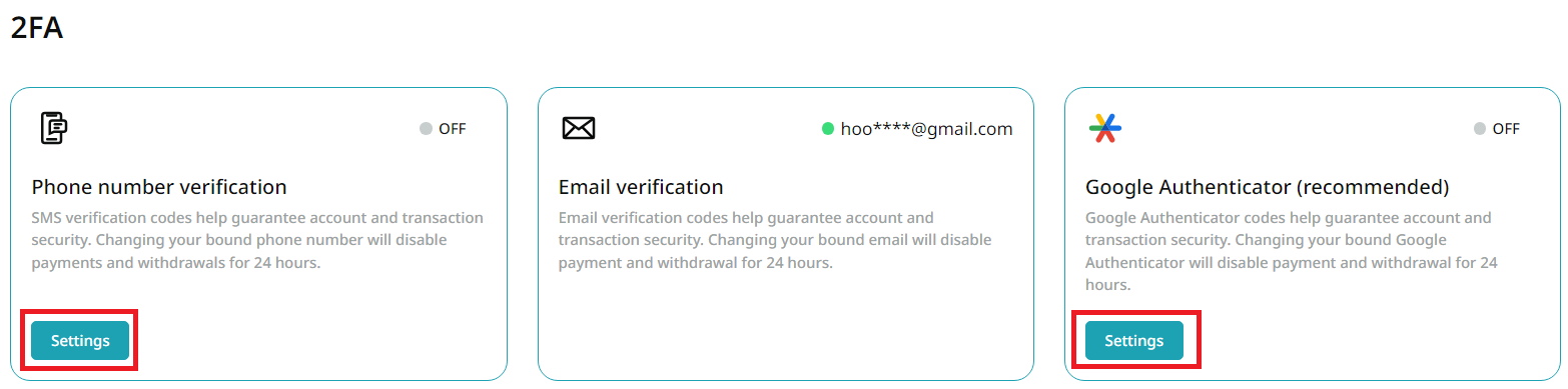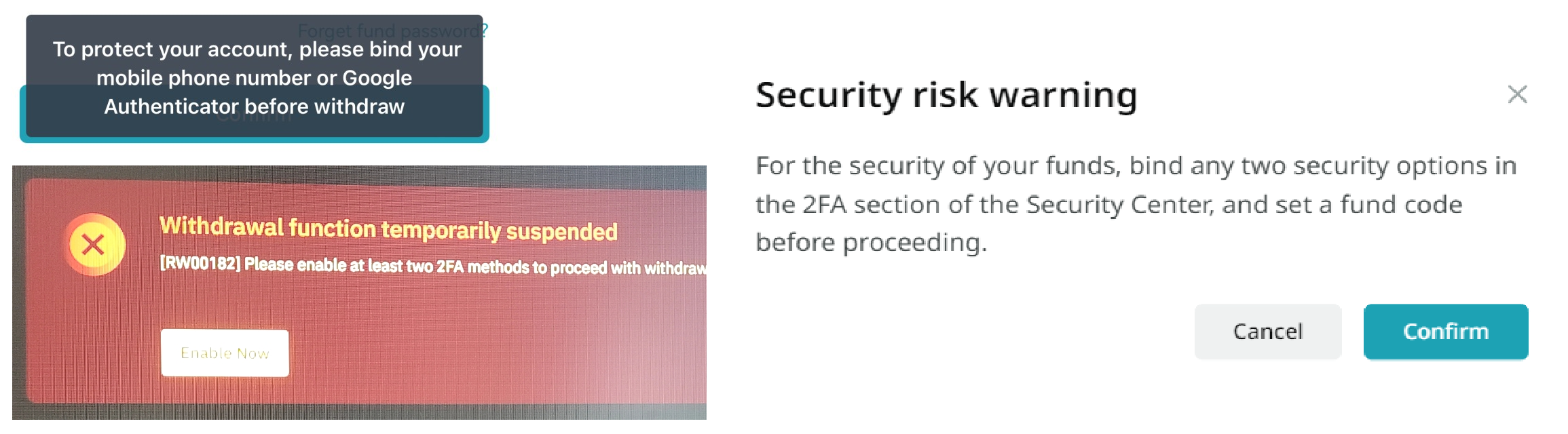 Please bind your mobile phone number..., Please enable at least two 2FA methods to proceed with..., Security risk Warning... 등의 메시지가 뜬다면, 출금 시 보안수단을 더 등록하라는 이야기다.