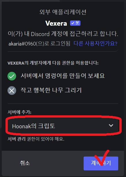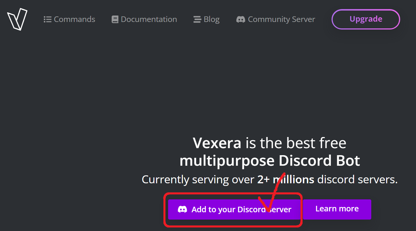 Vexera 홈페이지에 접속하여 'Add to Your Discord Server' 를 클릭한다. 이때, 봇을 서버에 추가하기 위해서는 사용자는 디스코드 서버 중 '서버 관리 권한'을 지닌 서버가 존재해야 한다. 그렇지 않으면, '서버에 추가' 선택창에 아무것도 뜨지 않는다.