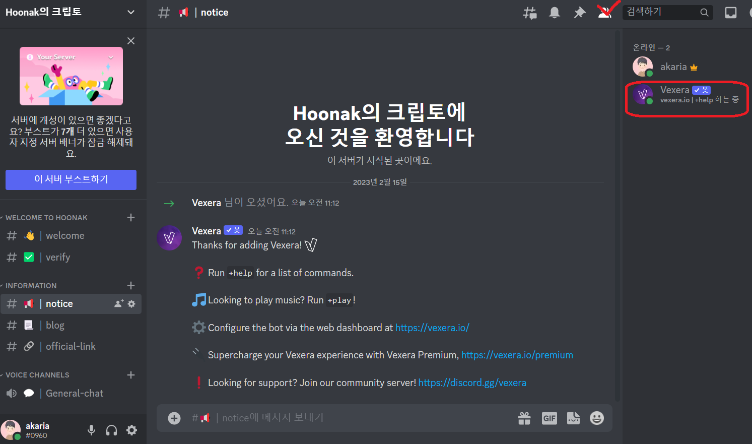Vexera를 정상적으로 서버에 설치하면, 디스코드 내에 Vexera 봇이 왔다는 메세지와 함께 멤버 목록창에 Vexera 봇이 있는 것을 확인할 수 있다.