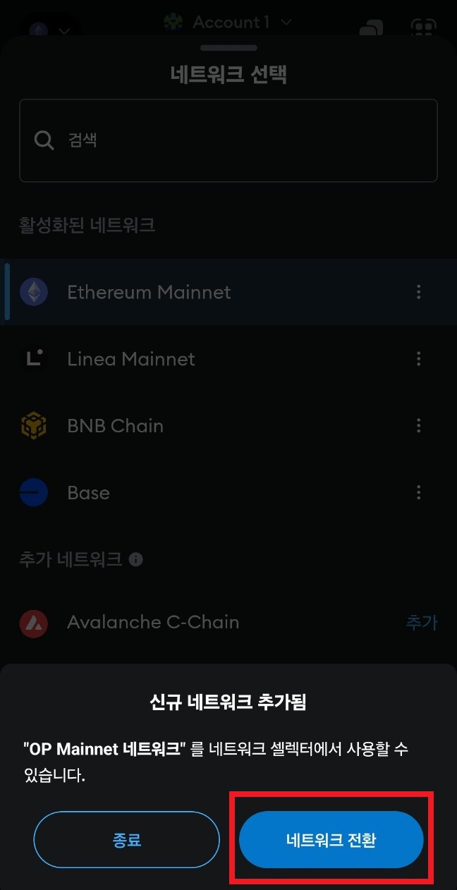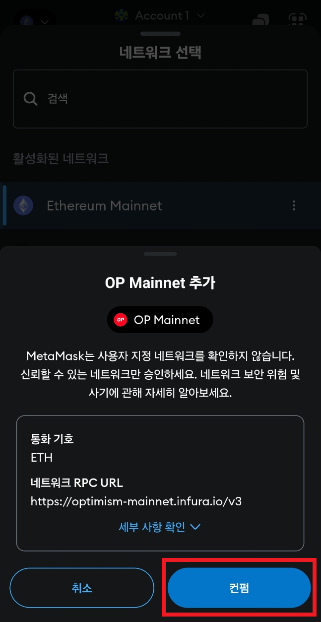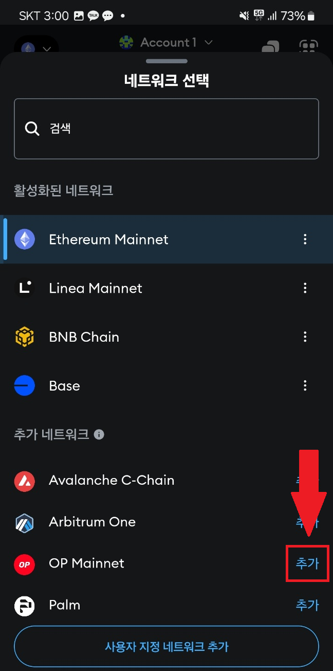 - 추가 네트워크에서 OP Mainnet 옆 '추가' 클릭
