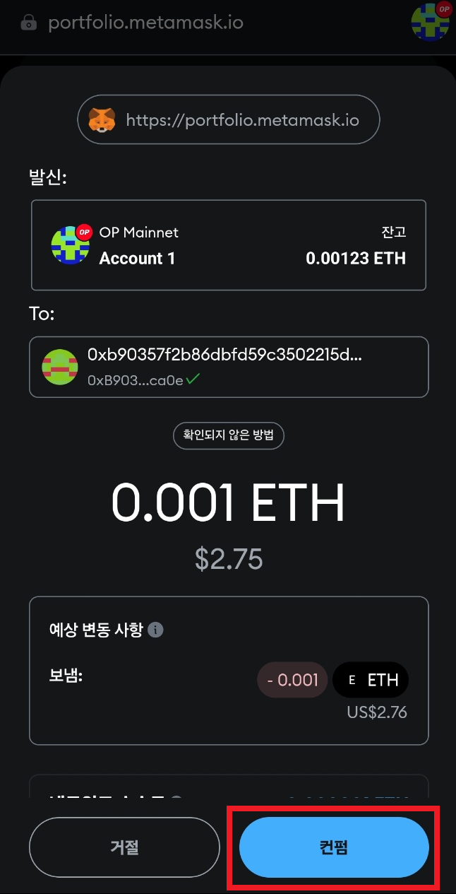 "op네트워크 ETH로 메타마스크에 보냈습니다."