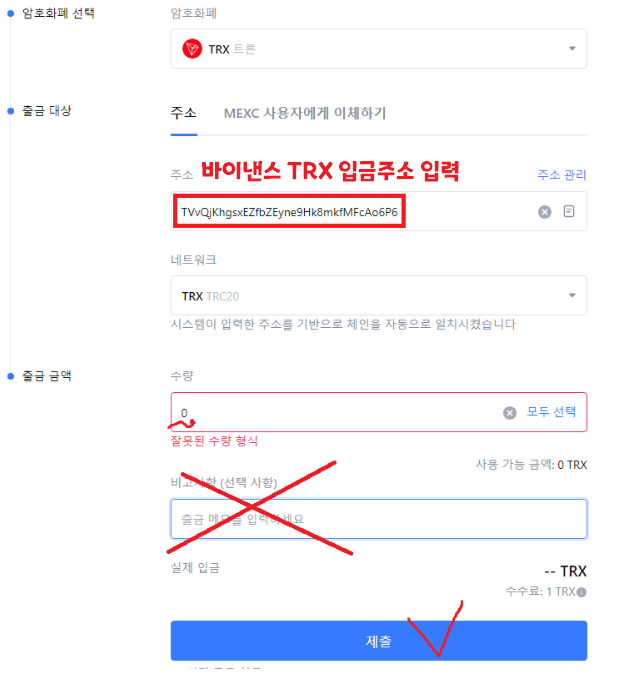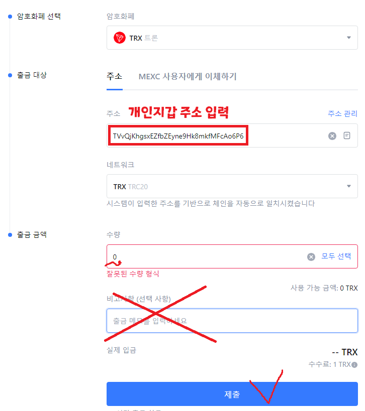 - 개인지갑 주소, 수량 입력 후 제출클릭 (트론은 비고사항 x)