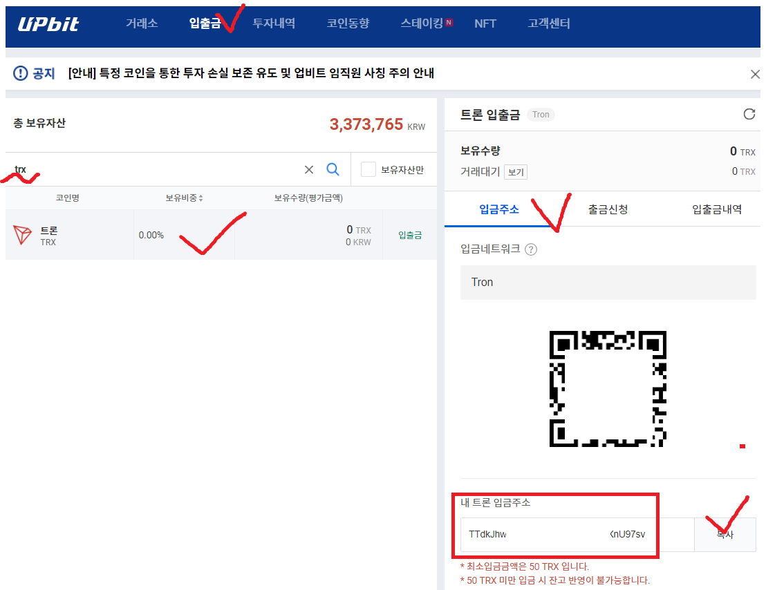※ 업비트 TRX 입금주소 보는 방법