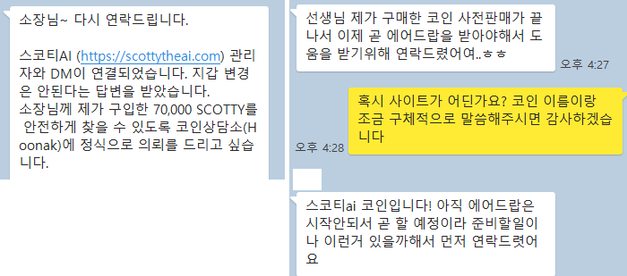 3월 초에 메타마스크가 해킹당하신 두 분께서 프리세일에 참여한 코인(스코티)이라도 구하고 싶다고 의뢰 요청을 주셨다. 나는 그때부터 스코티 프리세일 사이트를 둘러보고 공식 텔레그램에 참여하여 어떻게 하면 좋을지 고민을 하였다.