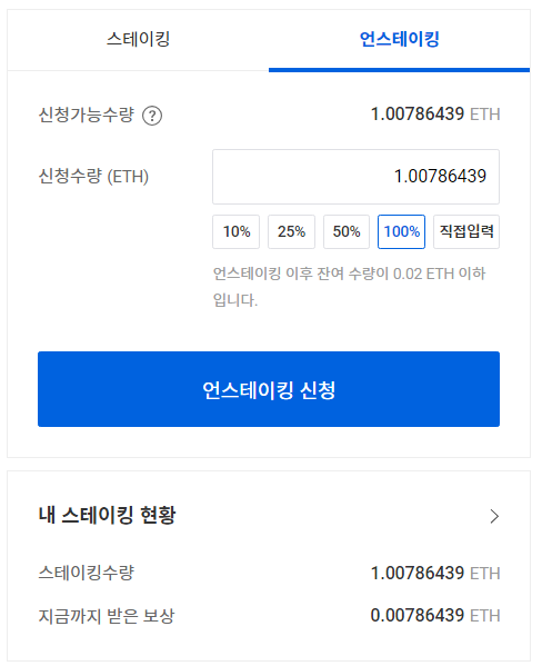 업비트에서 언스테이킹 신청은 언제나 가능하다. 하지만, 아까도 언급하였듯 언스테이킹 대기기간이 지나야 정상적으로 언스테이킹이 되며, 언스테이킹 된 ETH는 업비트 계좌로 입금된다.