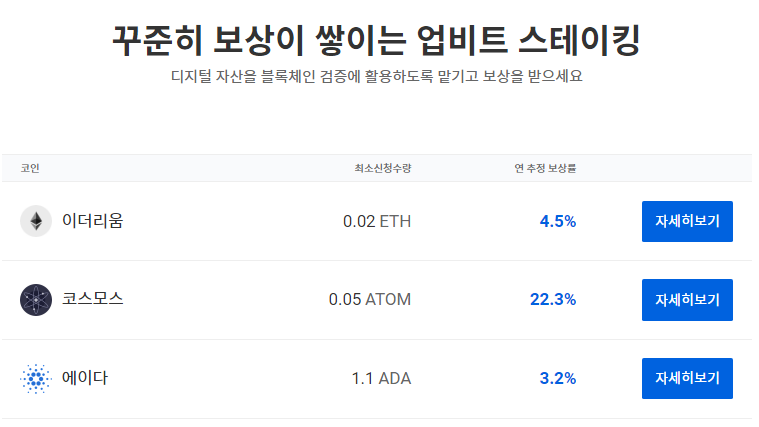 하지만, 일반인들은 이더리움 노드 실행하는 방법도 모르고, 32 ETH(약 8,200만 원)를 한꺼번에 예치하는 것도 부담이 될 수 있다. 업비트는 이런 부분을 착안하여 스테이킹 페이지를 만들었다.
