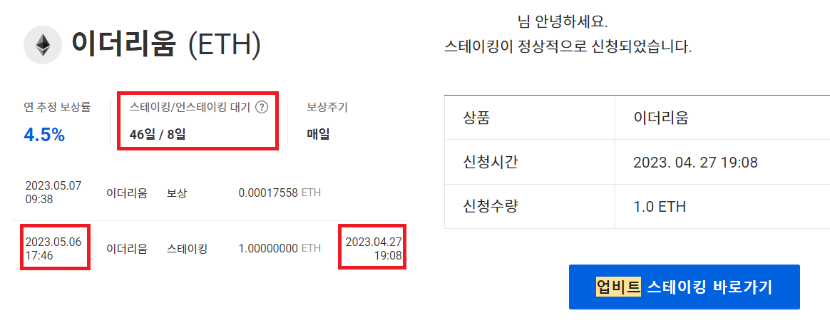 나는 2023년 4월 27일에 업비트에서 ETH스테이킹을 신청하였지만, 실제로 업비트에 이더리움이 스테이킹이 될 때까지는 10일의 시간이 소요되었다.
