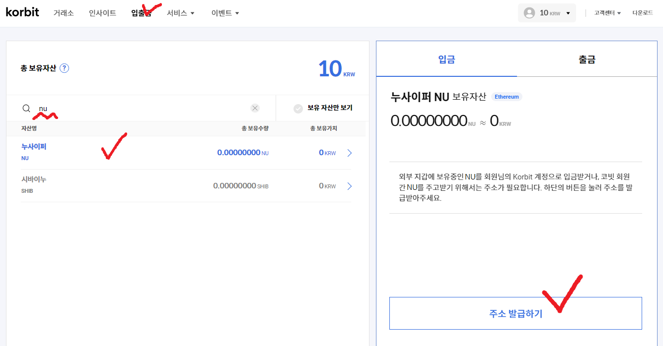 2) 코빗에서 누사이퍼 입금주소 생성하기