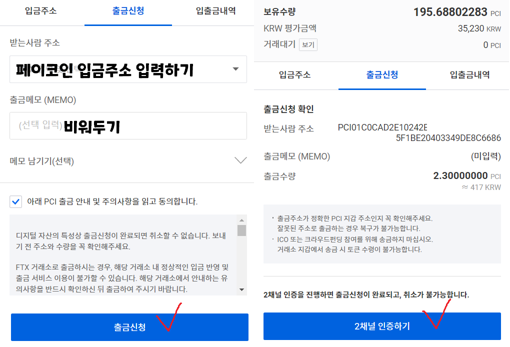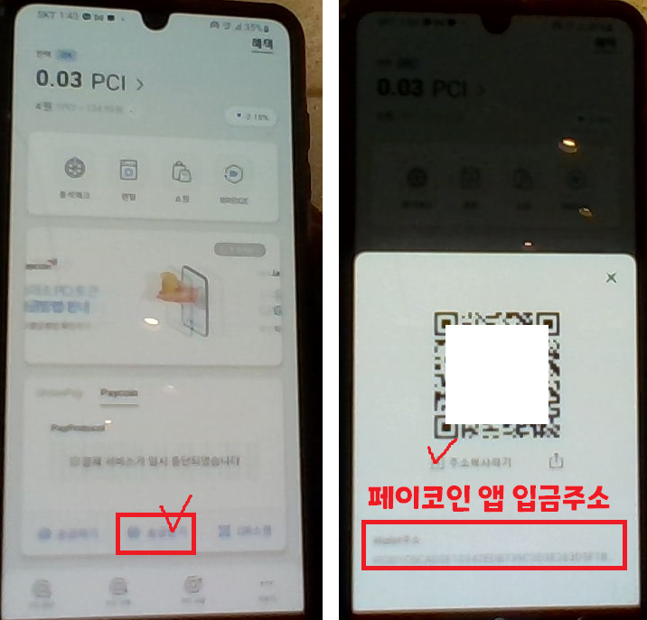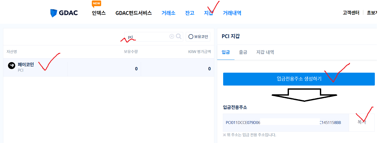 (※ 페이코인 메인넷 입금주소의 경우, 입금주소가 PCI로 시작한다 )