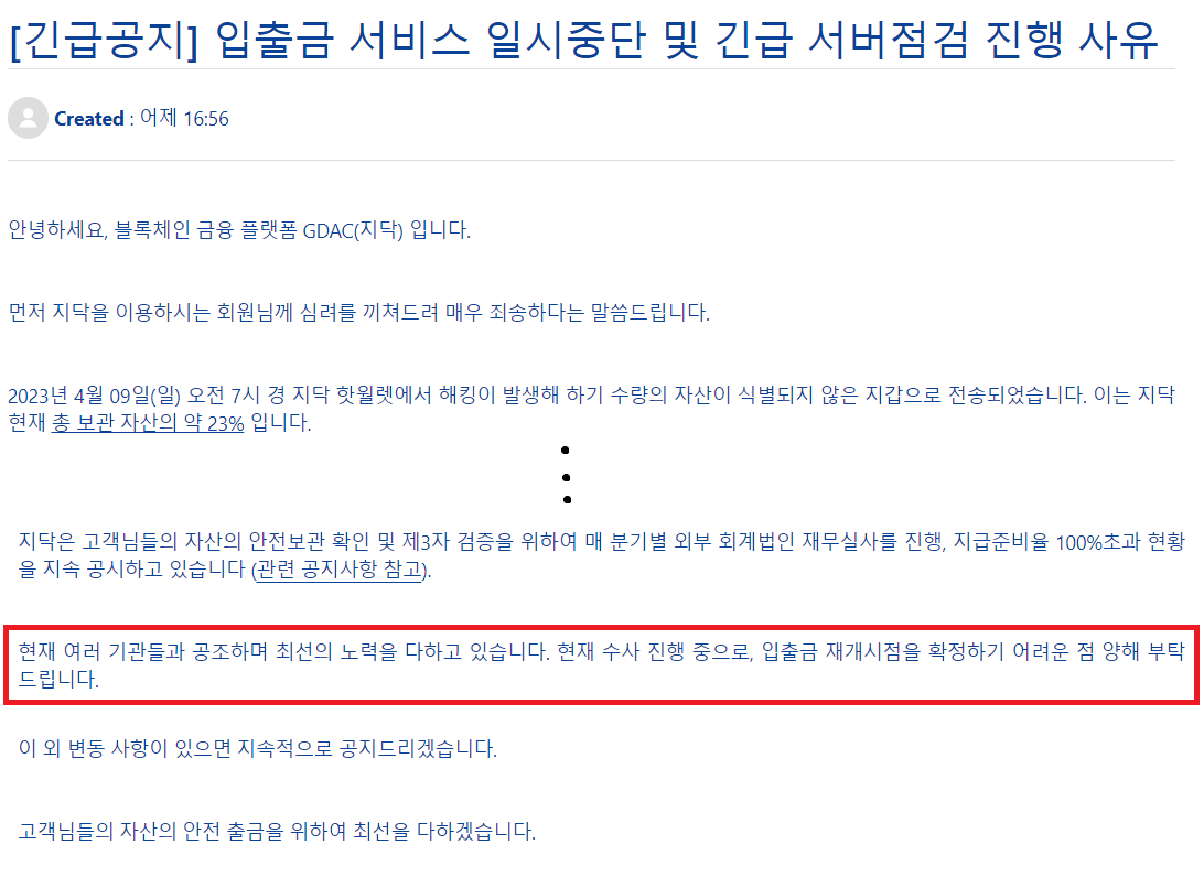 현재 지닥은 해킹 사건으로 인해 입출금 서비스를 일시중단하였음에도 입금주소가 생성이 가능하여, 지닥으로 입금했지만 입금 반영이 되지 않는 경우가 생기고 있다.