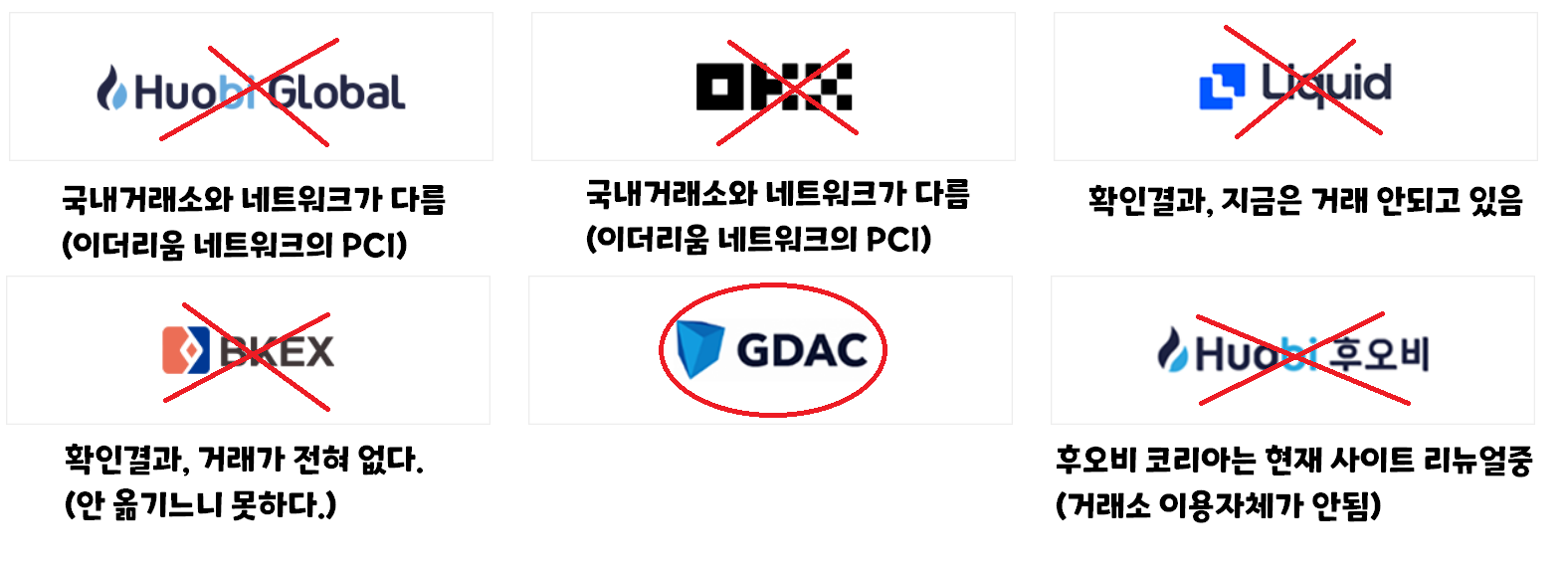 하지만, 필자가 확인결과, 후오비, OKX는 국내거래소와 입출금 네트워크가 달라(국내거래소 - 페이코인 메인넷 / 후오비, OKX - 이더리움 메인넷) 입금이 불가능하였고, Liquid, BKEX에서는 거래가 전혀 없었다. 또한, 후오비 코리아는 홈페이지 리뉴얼로 거래소 자체를 사용할 수 없었다.