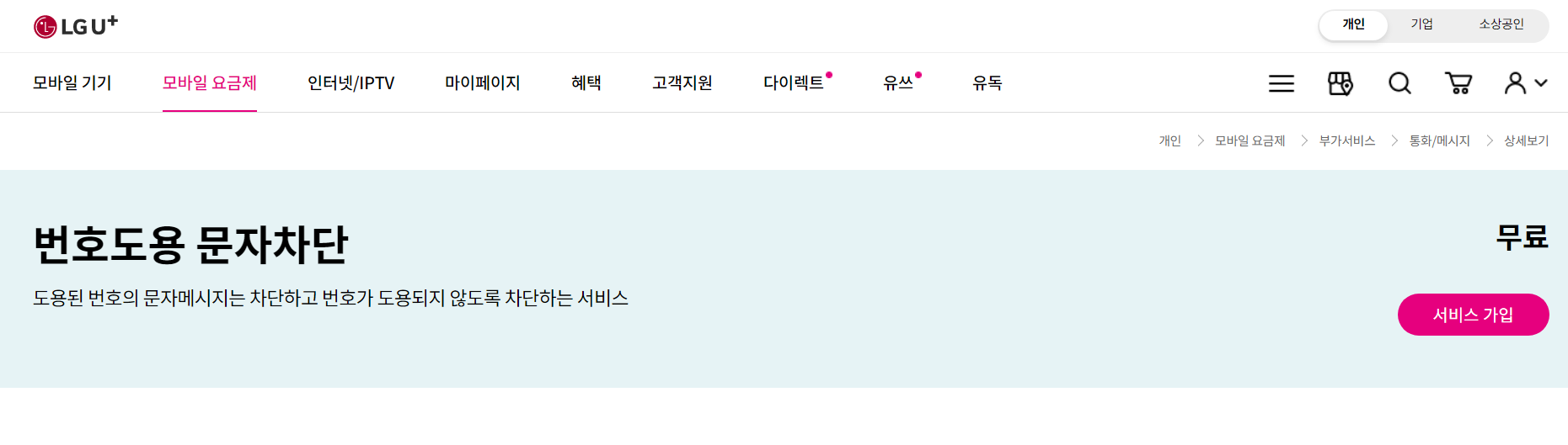 최근, lg U+ 관련 개인정보 유출사건과 여러 사건들로 인해 스팸문자가 계속해서 오고 있다. 그래서, 번호도용 문자차단 서비스를 신청하였다. 해당 서비스는 2일 후에 제대로 차단 기능이 작용한다고 하니 더이상 스팸문자가 안오길 바래야 겠다.