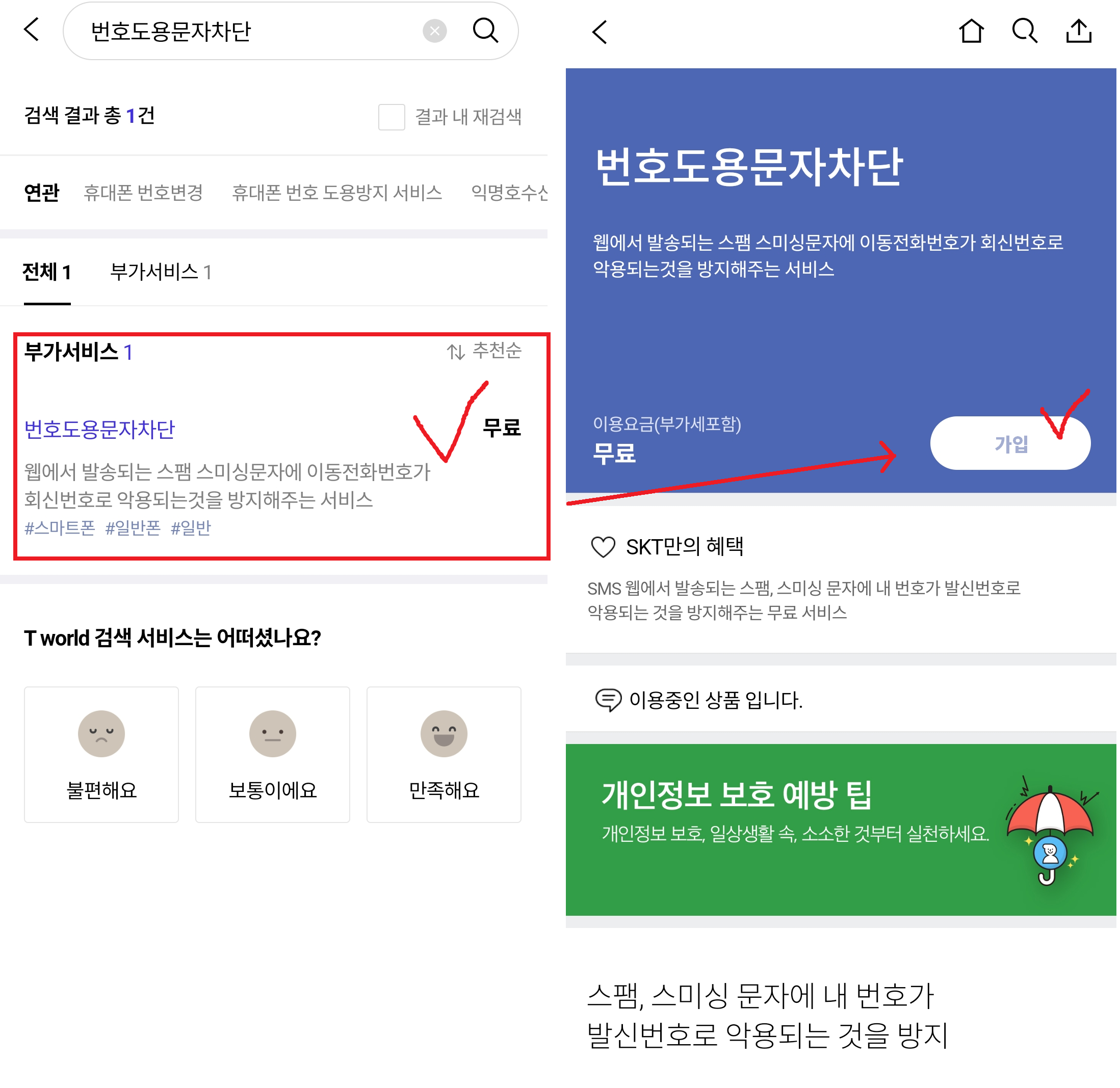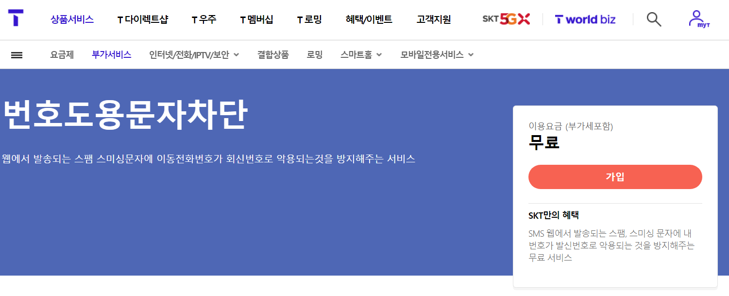 부가서비스 - 번호도용문자차단 클릭, 가입